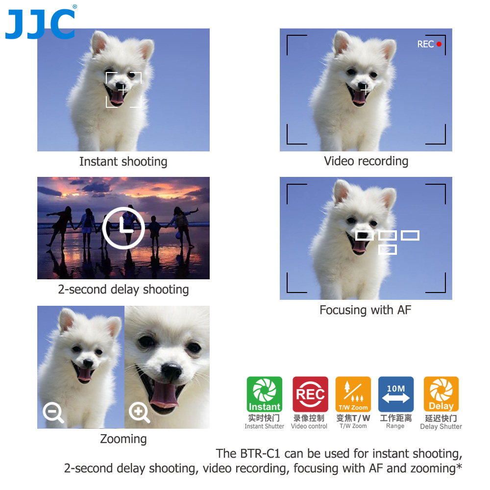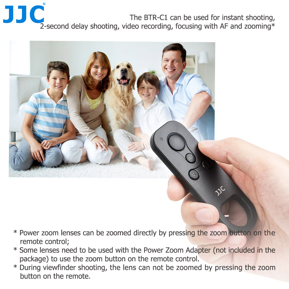 The JJC BTR-C1 Wireless Remote Control is specially designed for select Canon cameras. It allows you to remote your camera wirelessly with an operating distance of approx. 10m / 32.8' in any direction. The BTR-C1 can be used for instant shooting, 2-second delay shooting, video recording, focusing with AF and zooming*. The remote is portable and you can put it in your pocket or hang it on your key ring. It is powered by a CR2032 battery (included). JJC BTR-C1 replaces Canon BR-E1 wireless remote control.