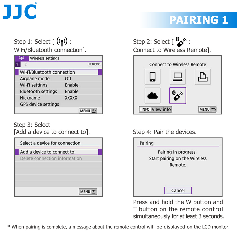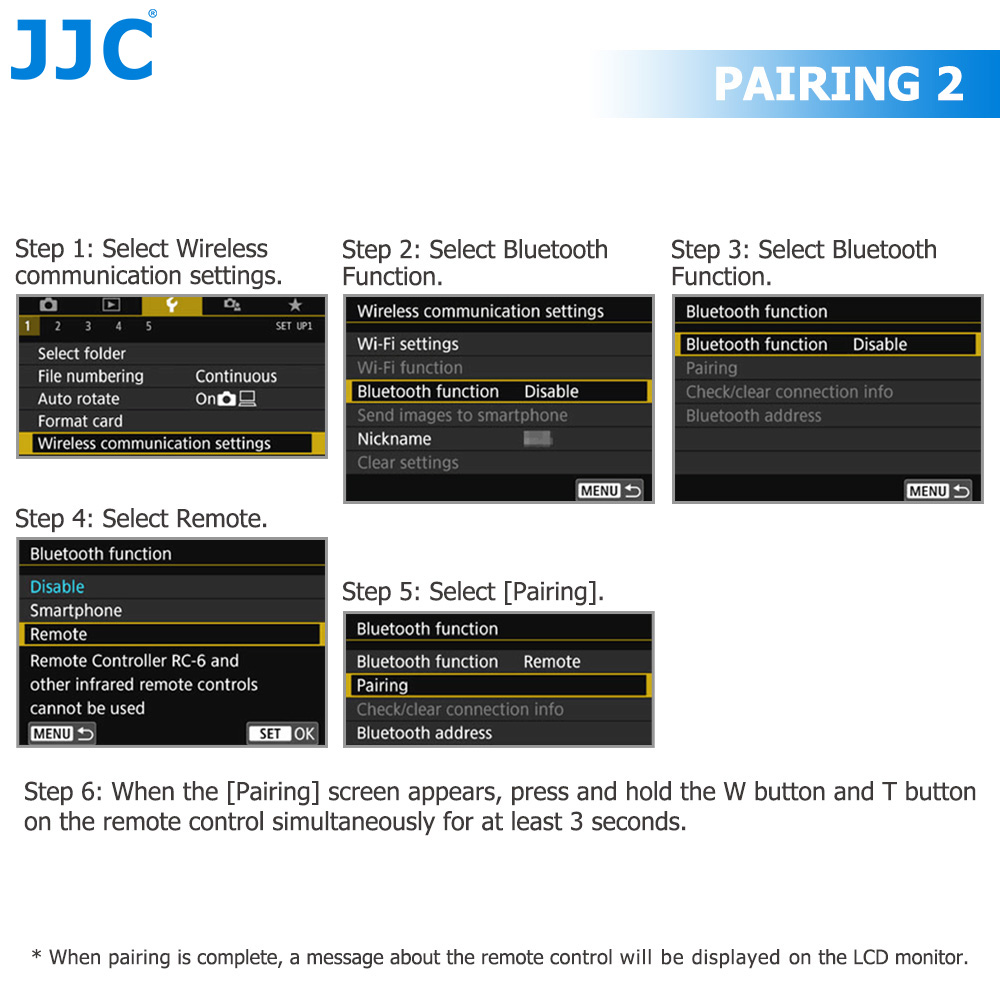 (1) Enable Bluetooth in camera menus (Menu - Setup tab - Wireless communication setting - Bluetooth function - Remote)