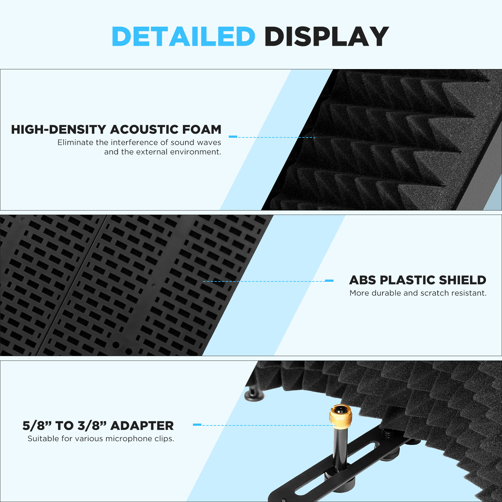 The BY-RF5P is designed with a long and narrow connecting plate, and equipped with essential accessories. All of them are useful on microphone mounting and boom attaching. Users can set the connecting rod on the connecting plate and mount a microphone on the rod through the 5/8" screw hole on the bottom of the microphone or through the 3/8" screw hole and a 5/8" to 3/8" adapter. And the booms or stands can be attached to it easily. In addition, the shield is designed with four support legs. These legs make it can stand independently on the desktop, which is very useful when you create your works on the table.