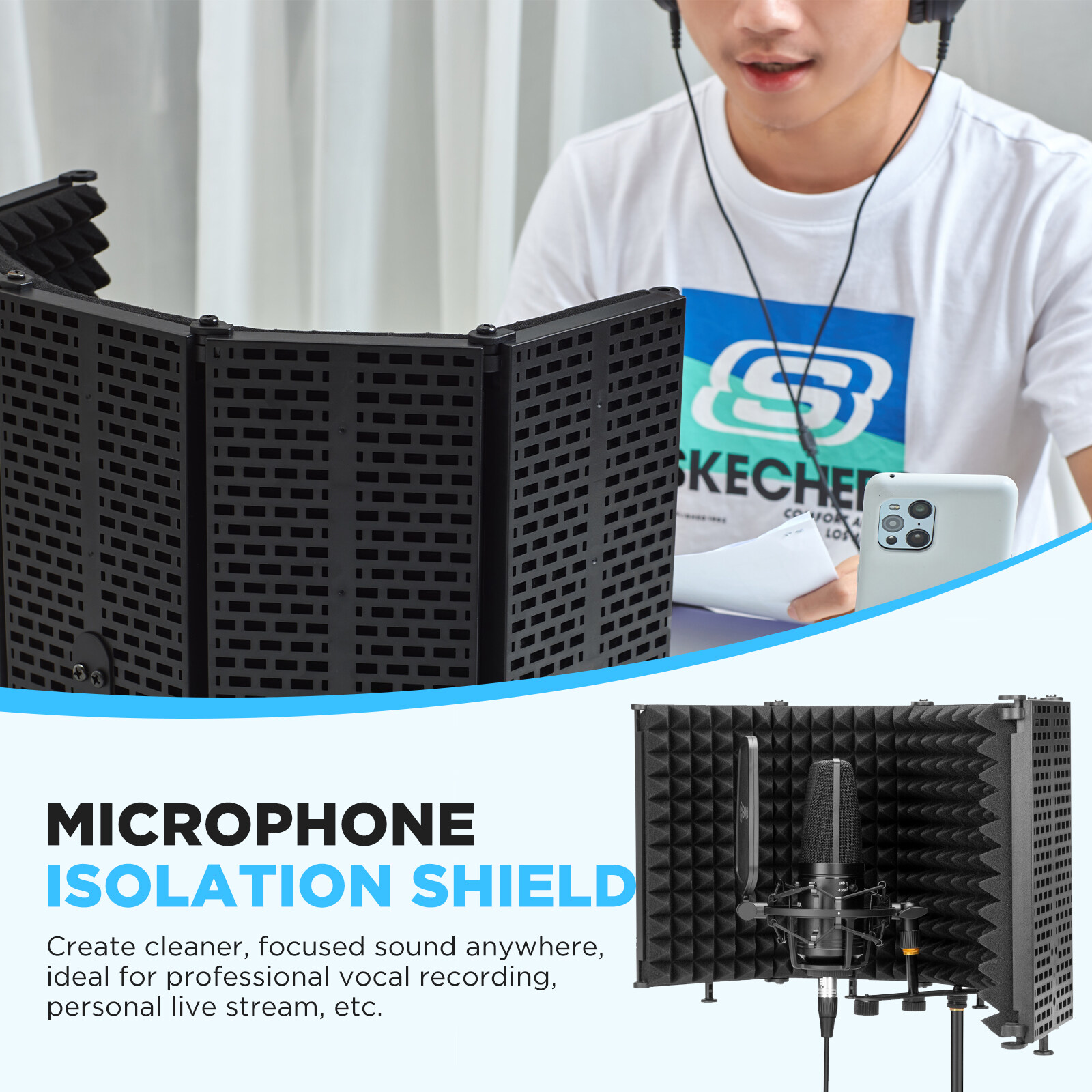 The BOYA BY-RF5P is a foldable microphone isolation shield, it help to reduce the reflection and noise effectively during recording, gathering a clear high-quality sound from home recording studio, live streaming, or professional vocal recording.