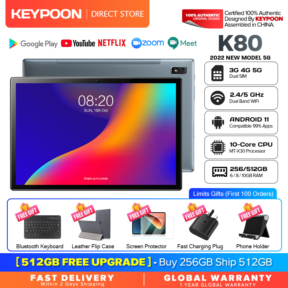 【2022 TOP2】KEYPOON K80 Tablet PC 10.1 Inches Android 11 8800mAh Dual SIM 5G WiFi Gaming Online Classroom Meeting for Students 10GB RAM 128GB 256GB 512GB ROM