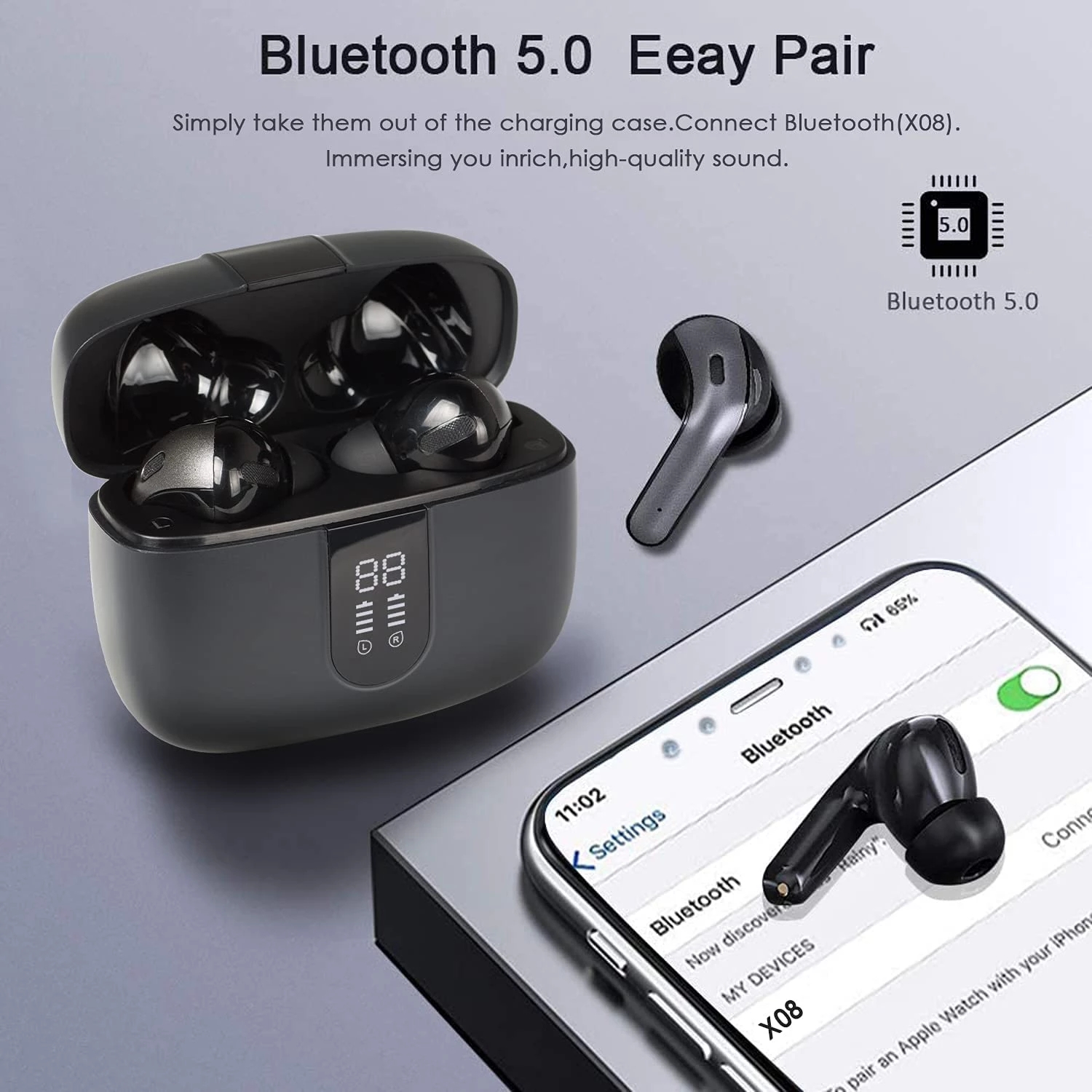【2022 NEW】COTIN X08 Bluetooth Headphones True Wireless Earbuds 60H Playback LED Power Display Earphones with Wireless Charging Case IPX5 Waterproof in-Ear Earbuds with Mic for TV Smart Phone Computer