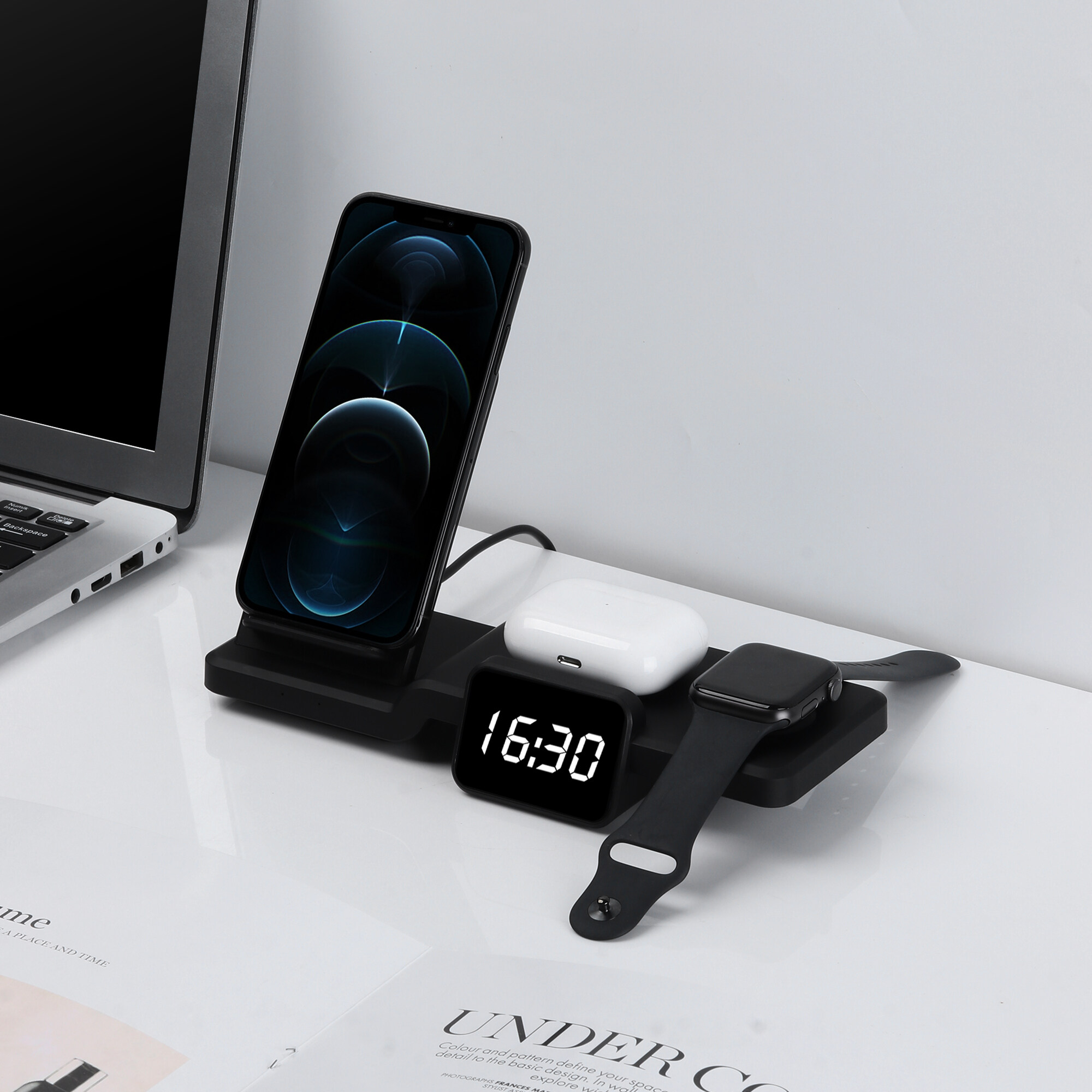 5 in 1 with Clock Time Display Wireless Charger Fast Charging Dock Station For iPhone 13 pro max 12 11 AirPods Pro 1/2/3 iWatch 6 5 4 3 2 1 SE Samsung S20 Wireless Charger Stand