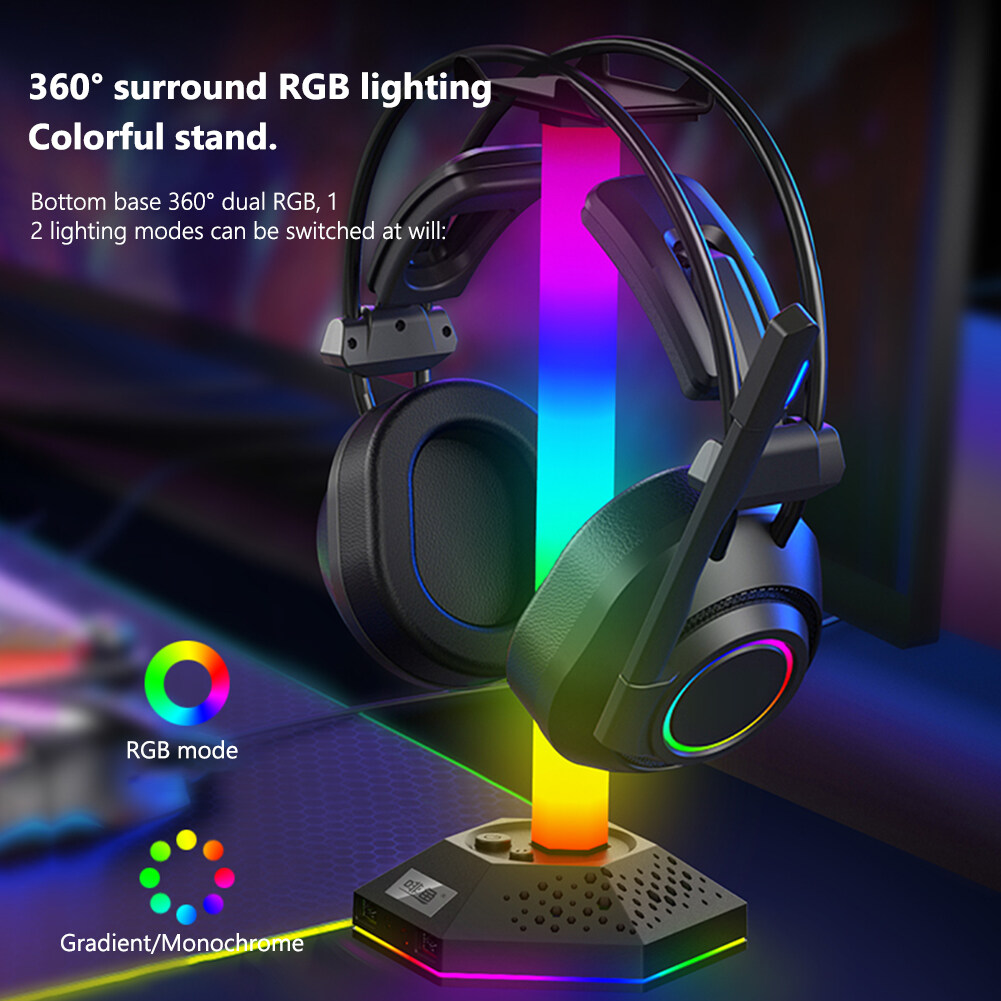RGB Gaming Headphone Stand 12 Light Modes Headset Holder Bracket Universal Headphones Hanger Hollow Translucent Base Dual USB2.0 Expansion Interface 3.5mm Audio
