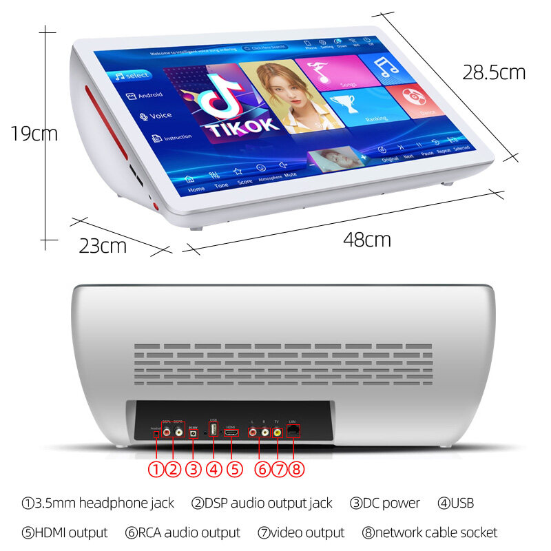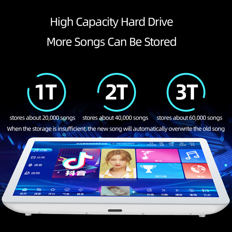 19-inch karaoke touch screen machine player, built-in wifi, support youtube installation.Built-in DSP, karaoke sound is nice, supports HDMI output and can be directly connected to TV.The karaoke touch screen machine player supports RCA audio output, which can be easily connected to the speaker system.1 million + cloud songs, popular music is updated monthly, and you only need to have a network to download the latest songs for free.The content of the songs are mainly Chinese and English songs, including various styles of music, pop, rock, jazz, folk, etc. Of course, there are also children's songs, and children can also sing karaoke! ! !The touch screen machine player has no stand and is placed directly on the desktop.There is no need to manage the hard disk storage manually. When the hard disk storage is full, the downloaded new songs will automatically overwrite the oldest previously downloaded old songs.