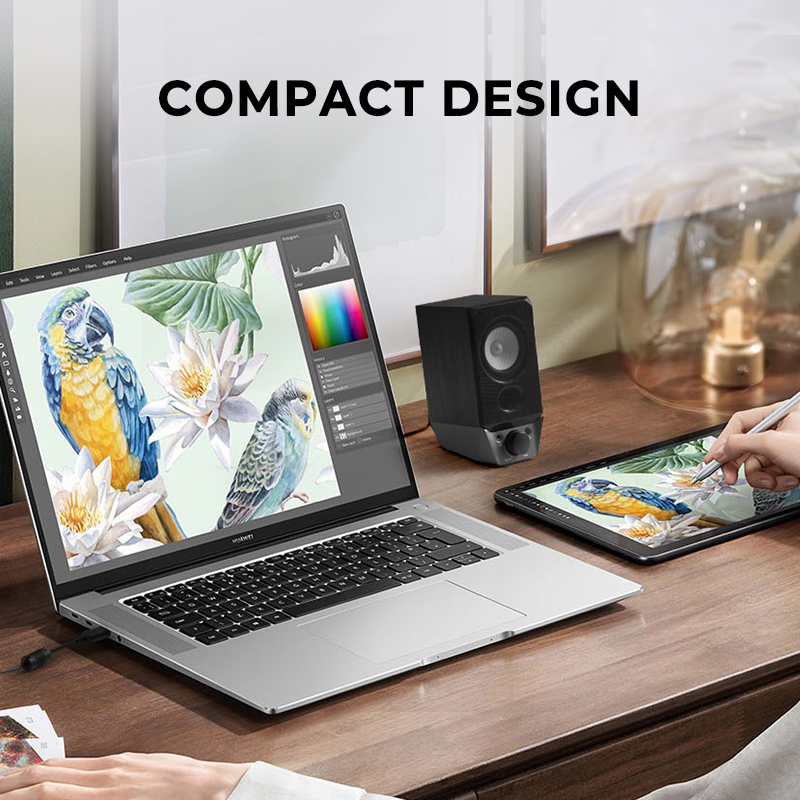 The built-in sound card allows you to connect to your PC via a single USB cable. Say goodbye to multiple wires and keep your workstation organized.