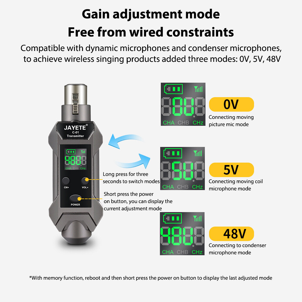 Gain adjustment mode, get rid of wired constraints. Compatible with dynamic microphones and condenser microphones for wireless singing. Three new modes are added: 0V (connected to dynamic microphone mode), 5V (connected to dynamic microphone mode), and 48V (connected to capacitive microphone mode).