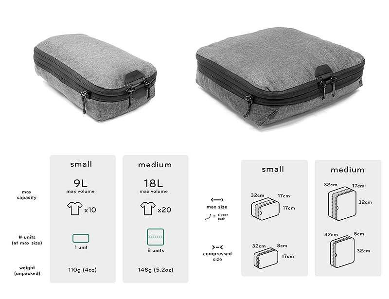 Compressible, easy to access, and instantly dividable, Peak Design Packing Cubes are functionally and aesthetically unmatched. A unique tear-away zipper lets you access contents quickly, unlike standard packing cubes with U-zip openings. An internal divider lets you separate clean and dirty clothes, and allows each compartment to expand/contract based on its contents. And, an expansion/compression zip provides additional space, or the ability to compress contents once packed. Outershell is a beautiful, self-healing 70D nylon/poly blend.